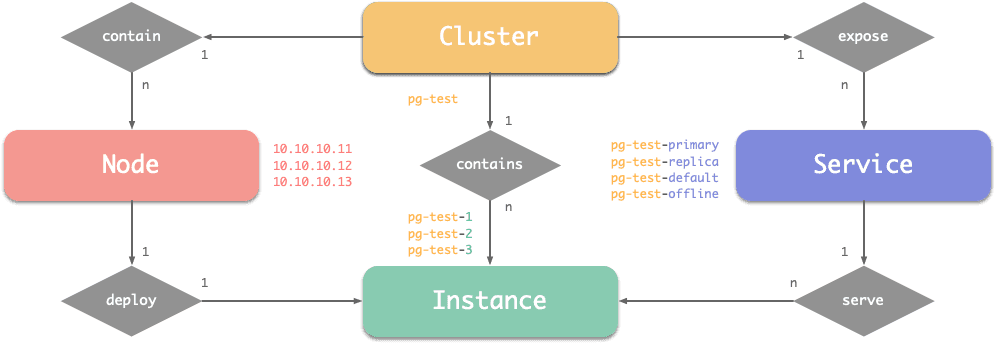 It defines a HA PostgreSQL cluster looks like the above, and here are related entities in this cluster: