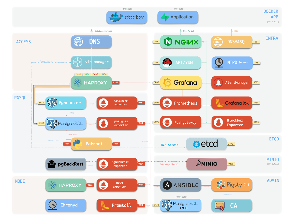 The patroni requires a functioning ETCD in your deployment, and pgbackrest can use the optional MinIO as centralized backup storage; and monitoring exporters will collect metrics & logs into the Infra module.